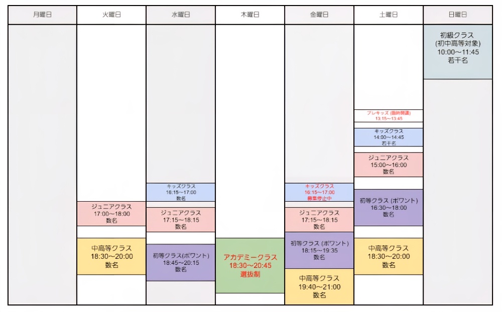 ☆ クラスレッスンは少人数定員制で行っていますので、ご入会ご検討の際には各曜日の各クラスの募集人数をご確認下さい。